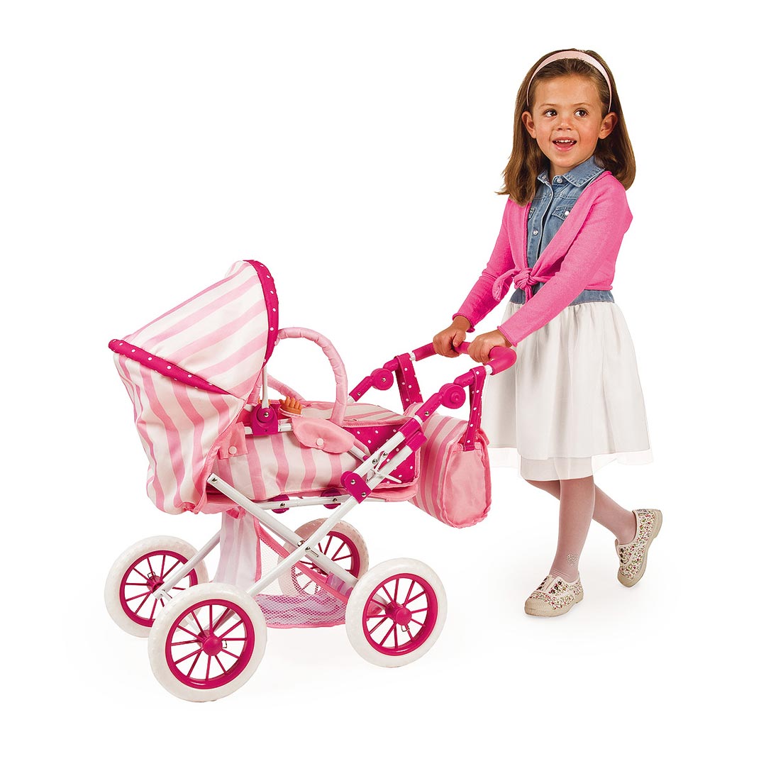 Amore Mio Carrozzina City rappresenta tutto quello di cui una bambina ha bisogno per girare in città insieme alla sua bambola! Manico regolabile, una bellissima borsetta porta cambi e persino un trasportino estraibile per giocare a fare la mamma.