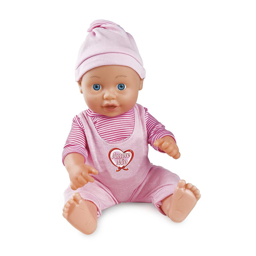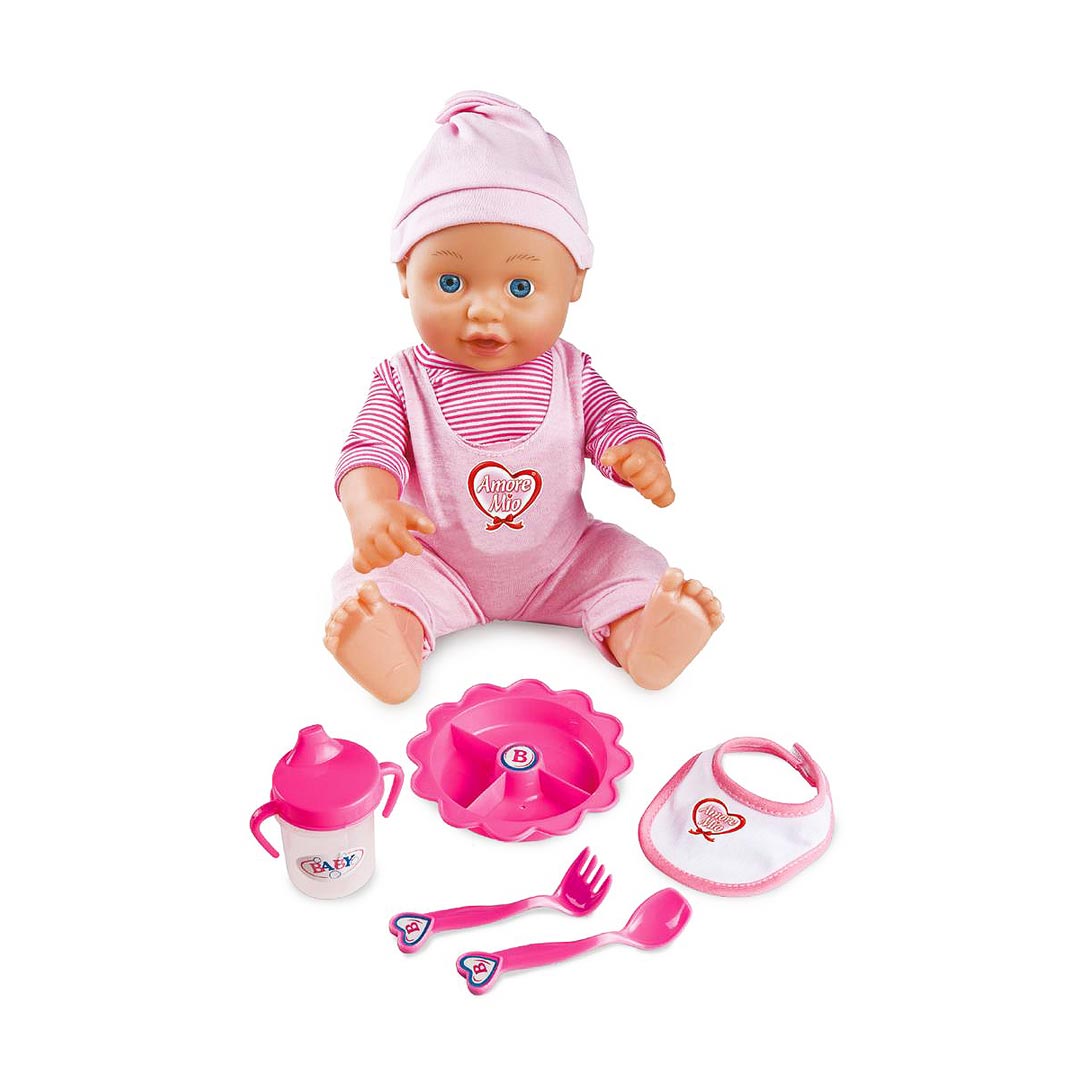 Amore mio Dolce Pappa è un bambolotto tenero e carino con la sua tutina a righe e il cappellino. Inclusi nella confezione gli accessori per fargli fare la pappa: piattino, bavaglino, cucchiaio, forchetta e bicchierino.