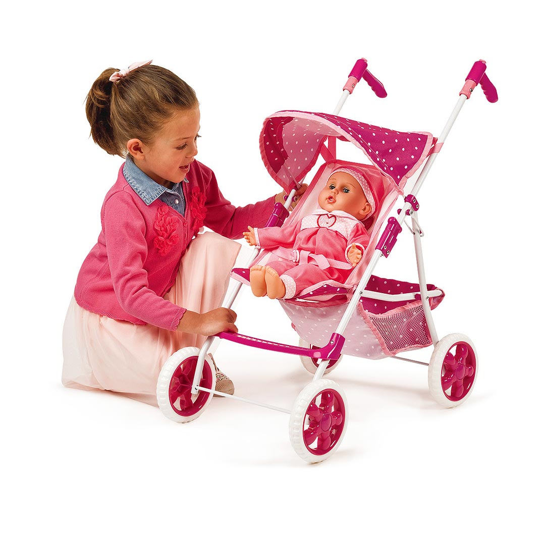 Deliziosamente decorato, Amore Mio Passeggino Urban ha i manici regolabili in altezza e direzione e una comodissima cappottina reclinabile per permettere alle bambine di andare in giro con le loro bambole preferite!